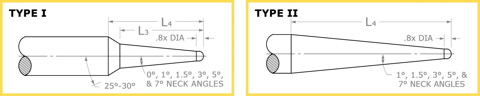 • 1°, 1.5°, 3°, 5°, and 7° neck angles to address common draft angles in molds
