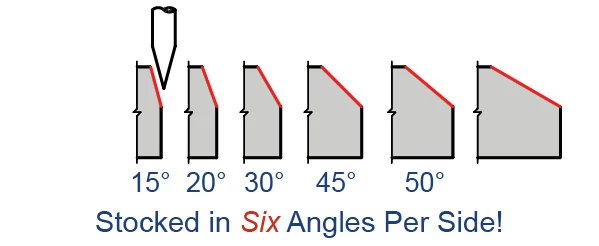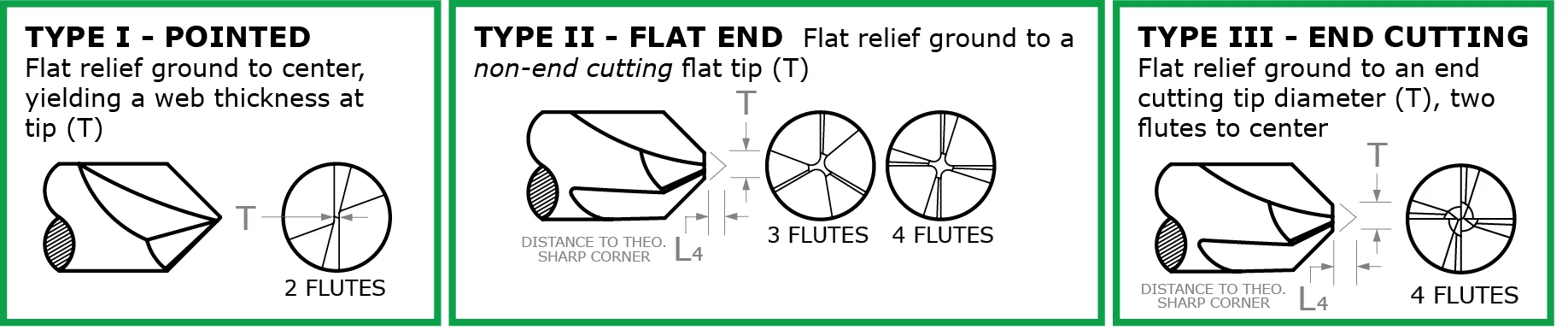 This offering of Harvey Tool Chamfer Cutters - Pointed & Flat End - Double-Ended feature tools in two unique styles: pointed, where a flat relief is ground to center, yielding a web thickness at the top; and flat end, where the flat relief is ground to a non-end cutting flat tip.