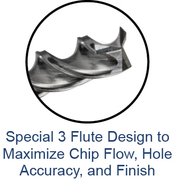 • Special 3 flute design to maximize chip flow, hole accuracy, and finish